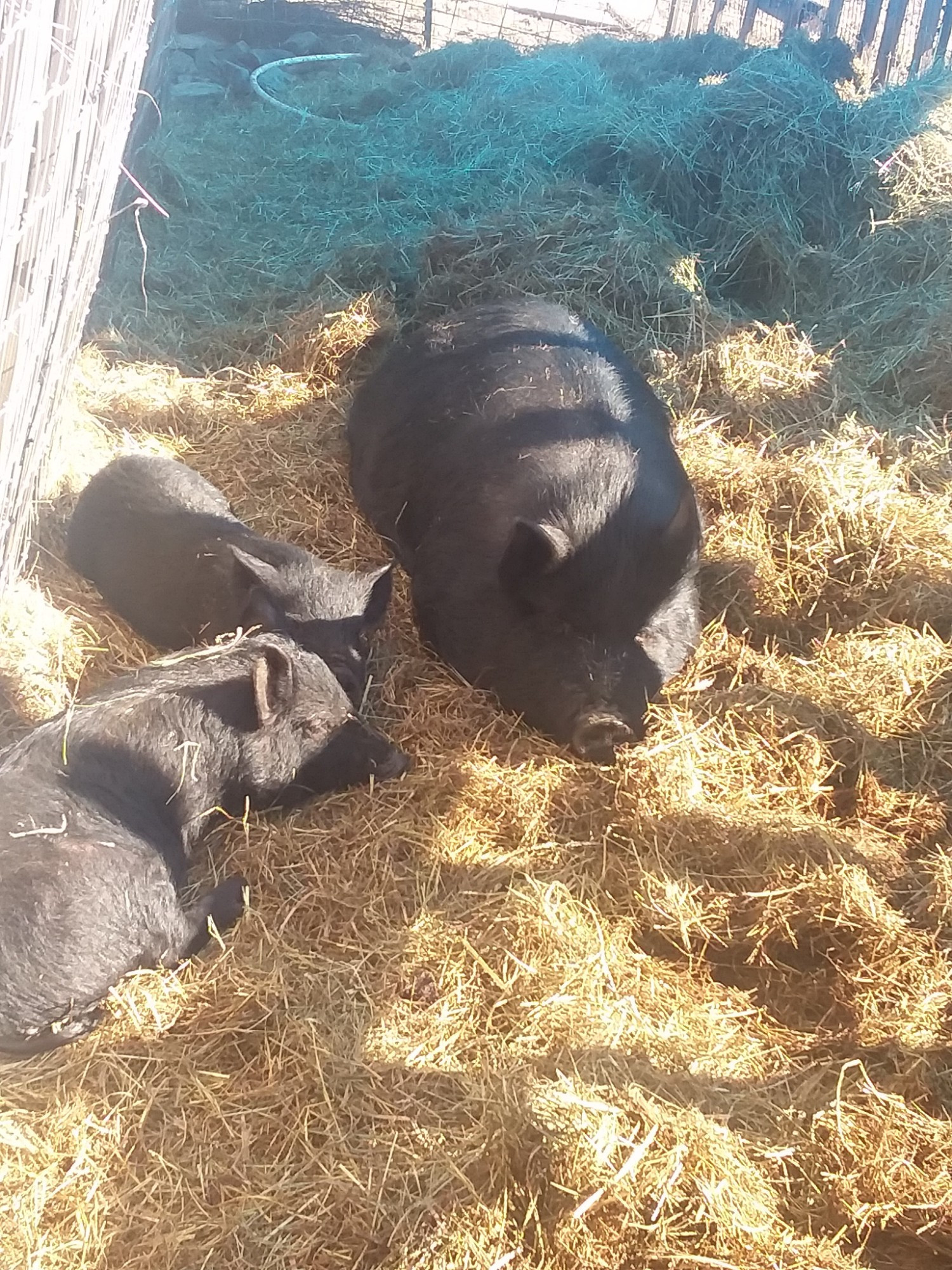 I traded 6 piglets for a mother and daughter alpaca. Then someone abandoned two little black sheep right in front of my house and after 2 years, they just live here now. I spin their wool and take care of them.